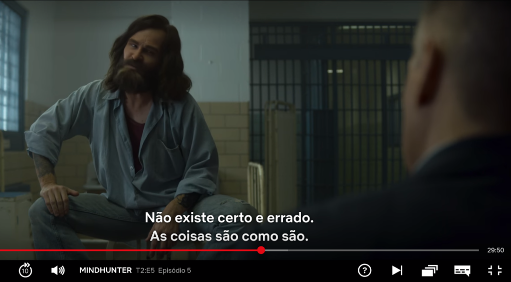 Na sequência, no mesmo episódio aparece a figura de Tex Watson, mas de fato não chega aos pés da carga dramático-narrativa que Mindhunter alcançou com a entrevista de Manson. Mindhunter decaiu bastante de seu potencial, mas bem poderia ser um contrastante complemento ao filme estrelado por Brad Pitt e Leonardo Di Caprio, particularmente nessa abordagem do mentor dos crimes e seus draculescos detalhes.