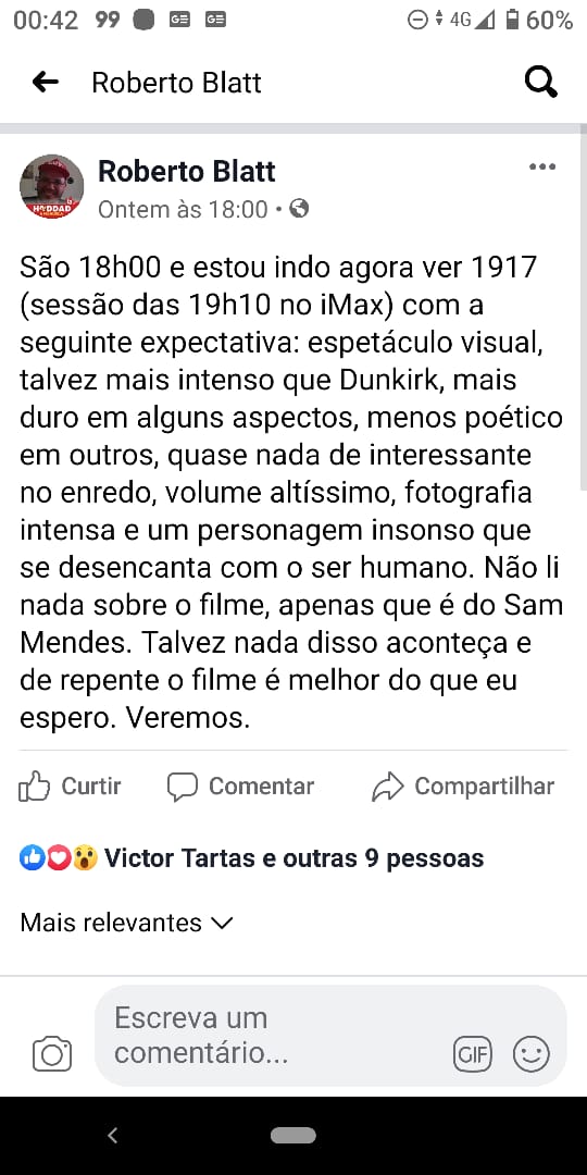 Antes de assistir ao filme de Sam Mendes, 1917 (EUA, 2019) eu fiz o seguinte post no facebook: